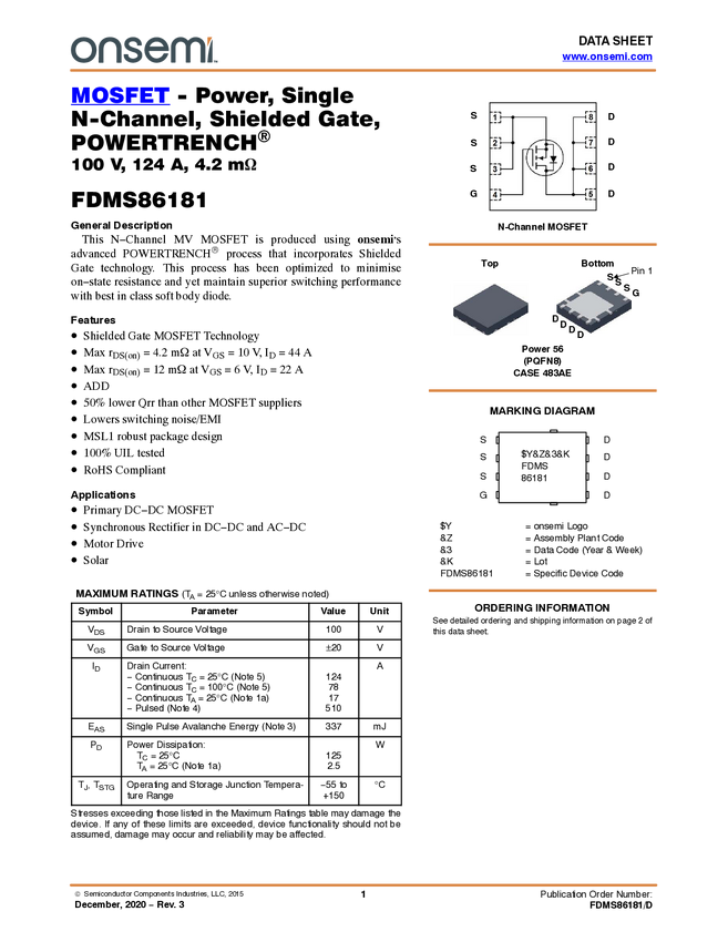 FDMS86181 N-Channel Shielded Gate PowerTrench<sup>® MOSFET 100V, 124A, 4.2mΩ