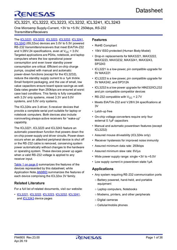 - ICL3232CAZ, ICL3232CAZ-T, ICL3232CBNZ, ICL3232CBNZ-T, ICL3232CBZ, ICL3232CBZ-T, ICL3232CVZ, ICL3232CVZ-T, ICL3232IAZ, ICL3232IAZ-T, ICL3232IBNZ, ICL3232IBNZ-T, ICL3232IBZ, ICL3232IBZ-T, ICL3232IVZ, ICL3232IVZ-T, ICL3232IVZ-T7A, ICL3232