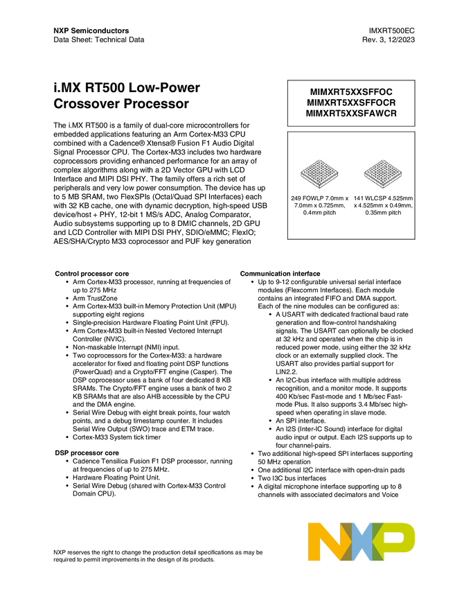 MIMXRT595SFAWC, MIMXRT595SFFOC, MIMXRT533SFFOC, MIMXRT555SFAWC, MIMXRT533SFAWC