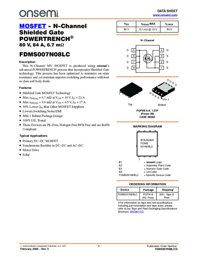 FDMS007N08LC Power MOSFET 80V Single N Channel, 84A, 6.7mΩ in Power 56 Package.