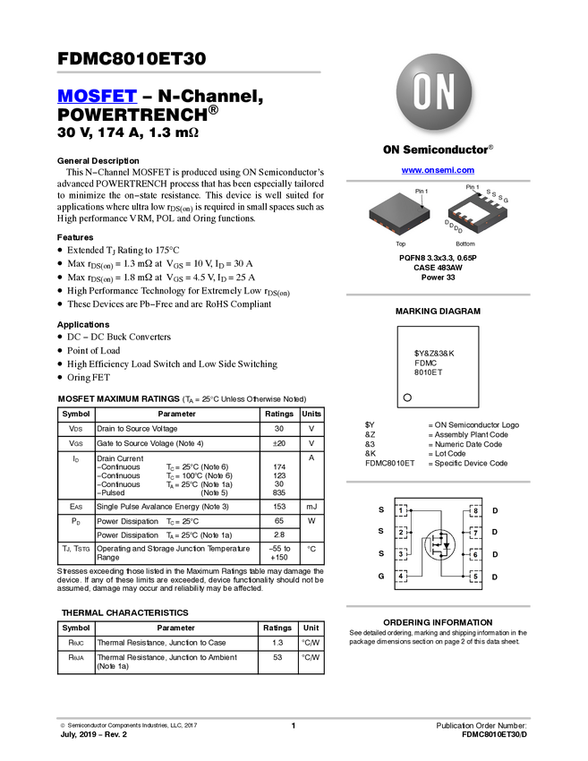 FDMC8010ET30 N-Channel PowerTrench<sup>® MOSFET 30V, 174A, 1.3mΩ