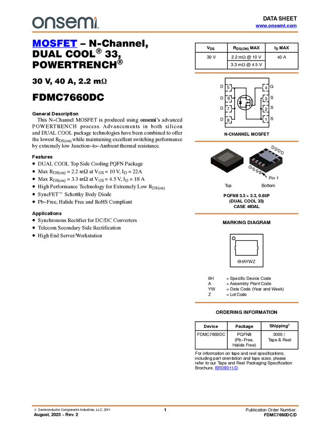 FDMC7660DC N-Channel Dual Cool<sup>TM 33 PowerTrench<sup>® MOSFET 30V, 40A, 2.2mΩ