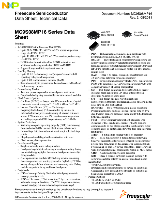 S08MP 8-bit MCU, S08 core, 16KB Flash, 50MHz, QFP 48