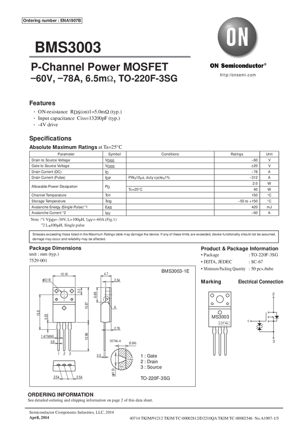 BMS3003 P-Channel Power MOSFET, -60V, -78A, 6.5mΩ
