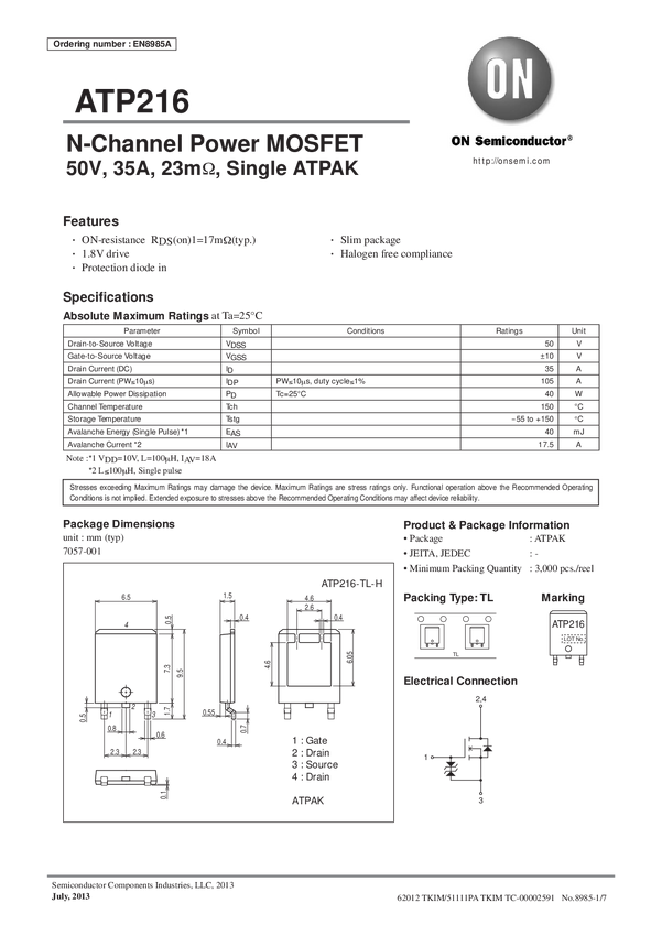 ATP216 N-Channel Power MOSFET, 50V, 35A, 23mOhm, Single ATPAK