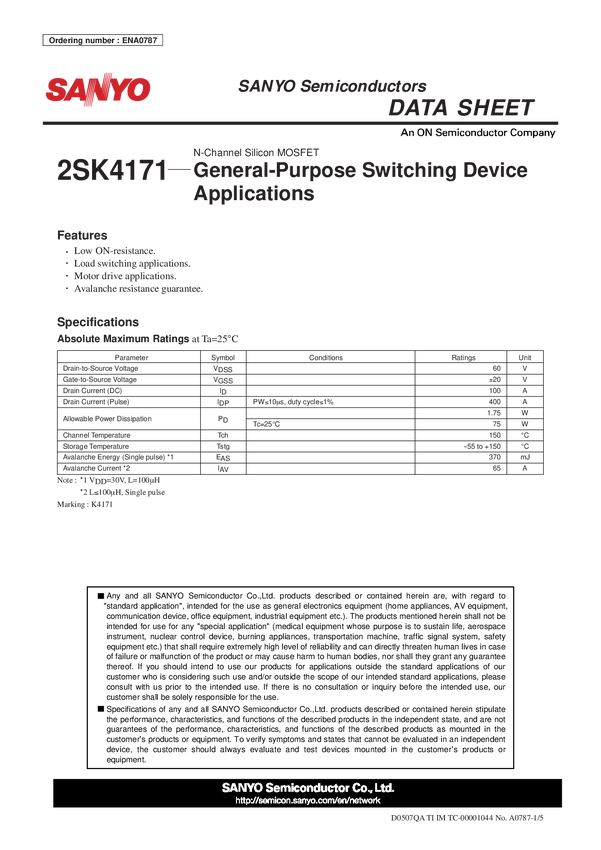 2SK4171 Power MOSFET 60 V, 100 A, 7.2 mOhm Single N-Channel