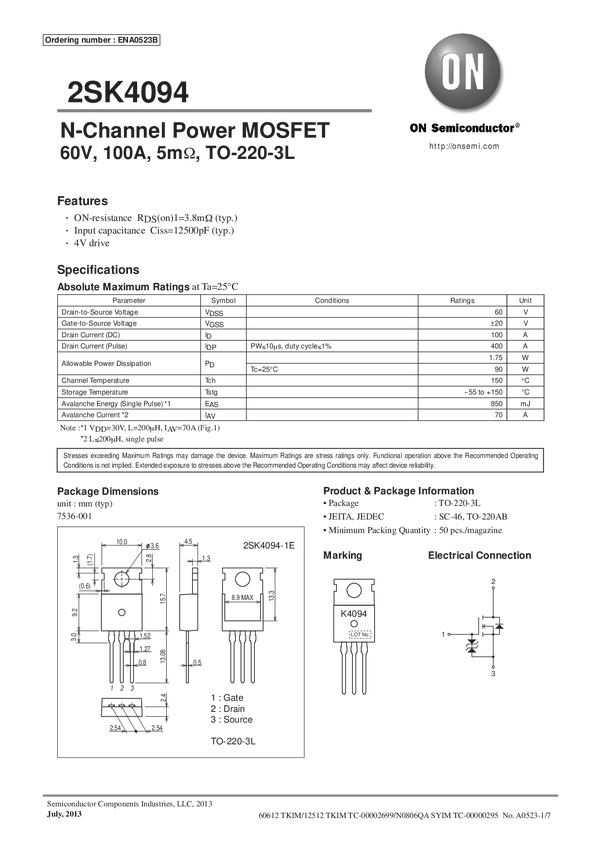 2SK4094 N-Channel Power MOSFET, 60V, 100A, 5mΩ, TO-220-3L