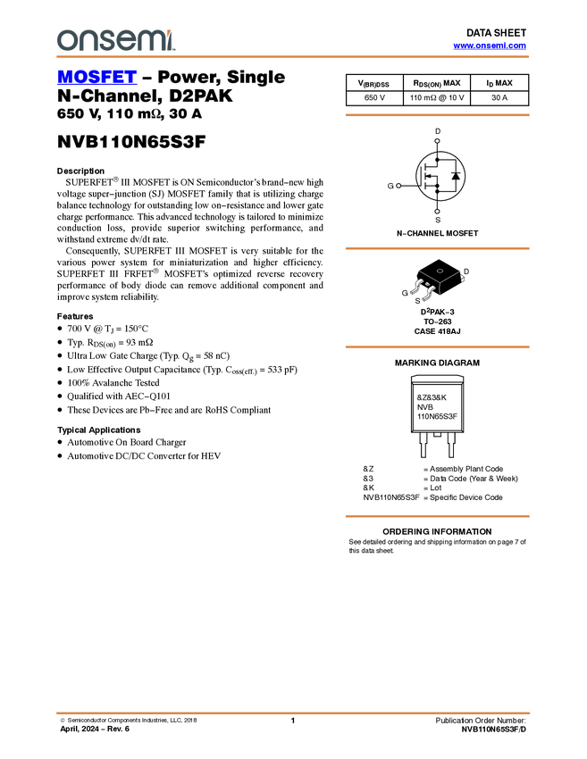 NVB110N65S3F Single N-Channel Power MOSFET SUPERFET<sup>® III, FRFET®, 650 V , 30 A, 110...