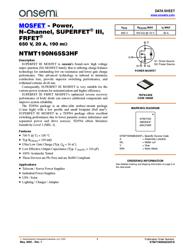 NTMT190N65S3HF Power MOSFET, N-Channel, SUPERFET<sup>® III, FRFET<sup>®, 650 V, 20 A, 190...