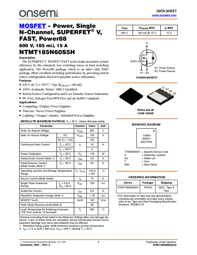NTMT185N60S5H Power MOSFET, N-Channel, SUPERFET® V, FAST, 600 V, 15 A, 185 mΩ, Power88