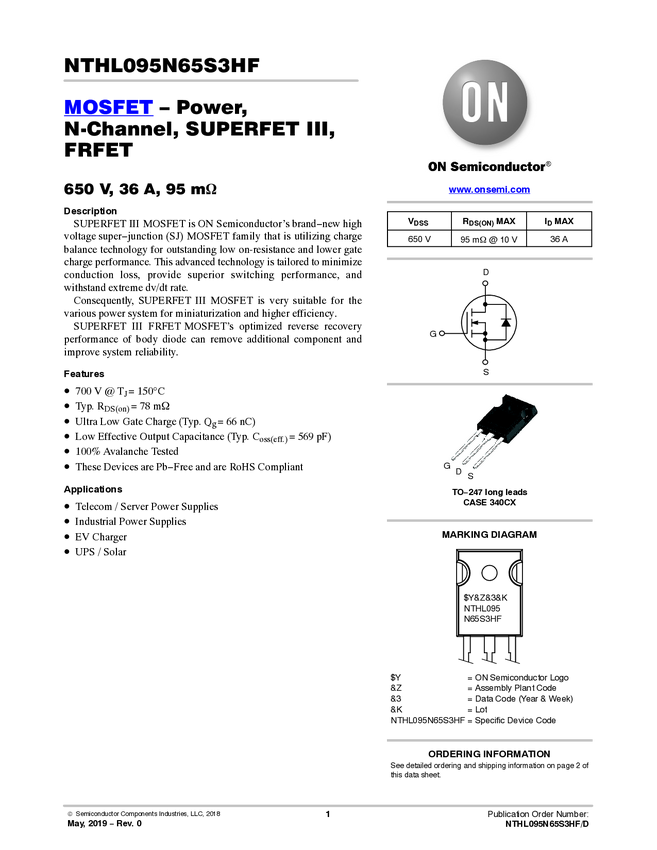 NTHL095N65S3HF Power MOSFET, N-Channel, SUPERFET<sup>® III, FRFET<sup>®, 650 V, 36 A, 95 m...