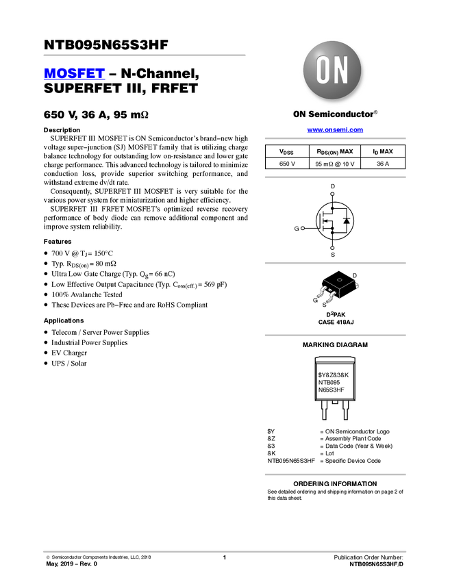 NTB095N65S3HF Power MOSFET, N-Channel, SUPERFET<sup>® III, FRFET<sup>®, 650 V, 36 A, 95 m...