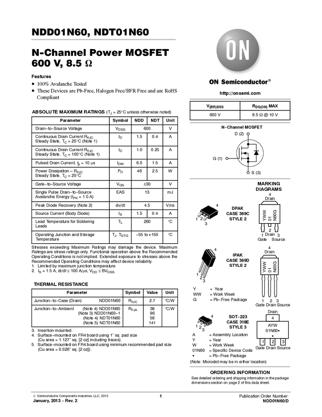 NDT01N60 Power MOSFET 600V 0.4A 8.5 Ohm Single N-Channel SOT-223