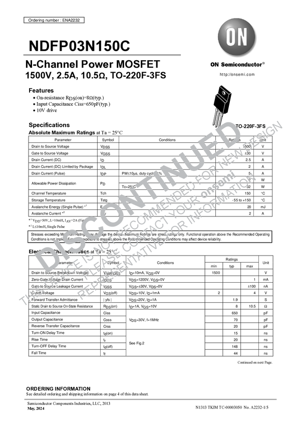 NDFP03N150C N-Channel Power MOSFET, 1500V, 2.5A, 10.5Ω