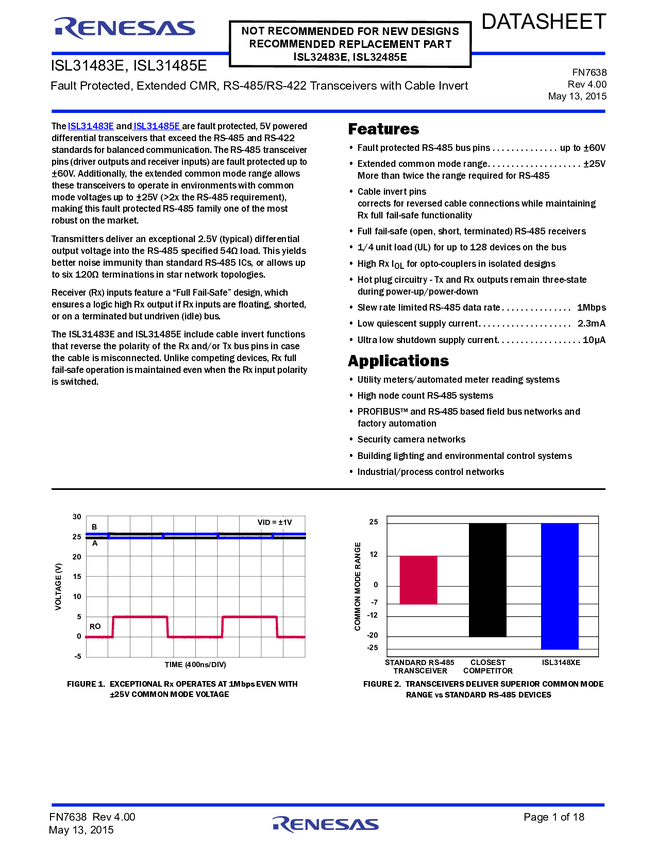 ISL31485EIBZ Fault Protected, Extended CMR, RS-485/RS-422 Transceivers with Cable Invert