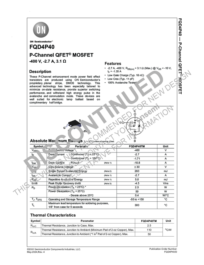 FQD4P40 Power MOSFET, P-Channel, QFET<sup>®, -400 V, -2.7 A, 3.1 Ω, DPAK