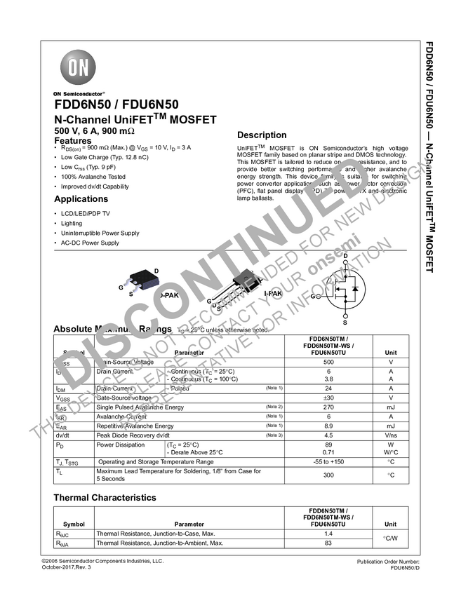 FDD6N50 Power MOSFET, N-Channel, UniFET<sup>TM, 500 V, 6 A, 900 mΩ, IPAK
