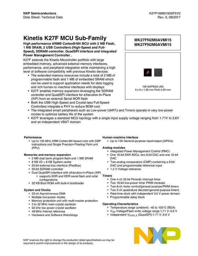 Kinetis<sup>&#174;</sup> K27-150 MHz, 2x USB, 2MB Flash, 1MB SRAM Microcontrollers (MCUs) based on Arm<sup>&#174;</sup> Cortex<sup>&#174;</sup>-M4 Core