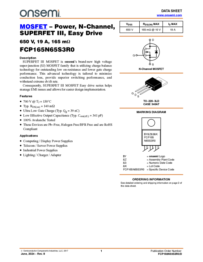 FCP165N65S3R0 Power MOSFET, N-Channel, SUPERFET<sup>® III, Easy Drive, 650 V, 19 A, 165 m...