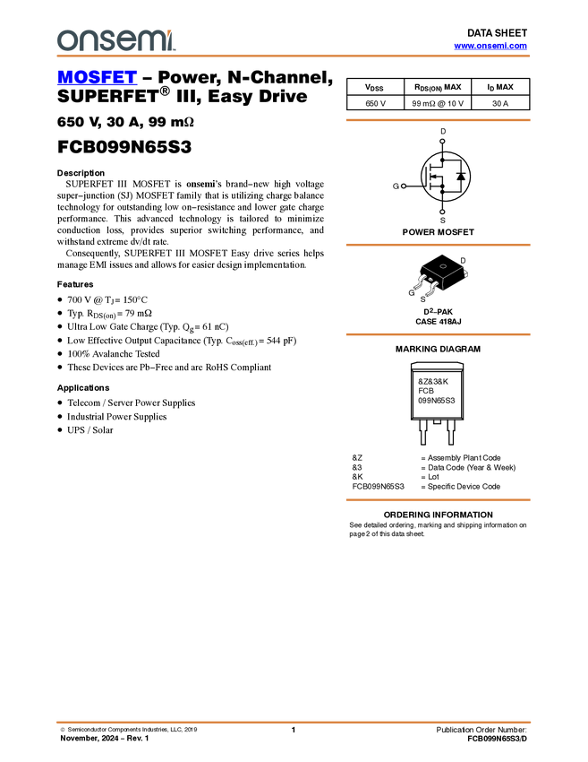 FCB099N65S3 Power MOSFET, N-Channel, SUPERFET<sup>® III, Easy Drive, 650 V, 30 A, 99 mΩ...
