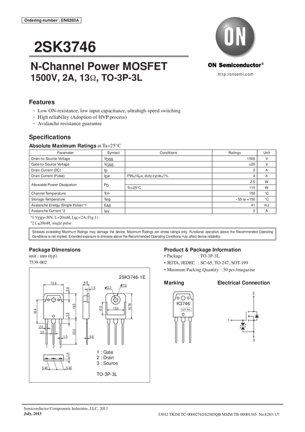 2SK3746 N-Channel Power MOSFET, 1500V, 2A, 13Ω, TO-3P-3L