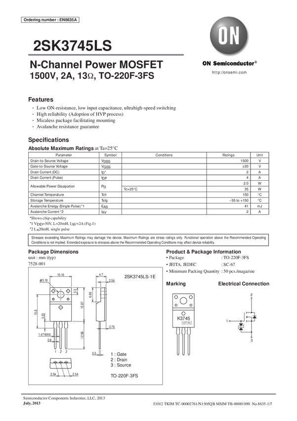 2SK3745LS N-Channel Power MOSFET, 1500V, 2A, 13Ω, TO-220F-3FS