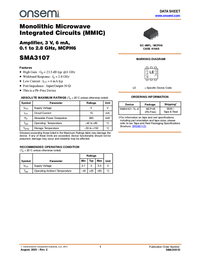SMA3107 MMIC, RF Amplifier, 3 V, 6 mA, 0.1 to 2.8 GHz