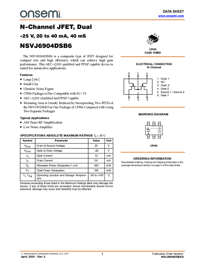 NSVJ6904DSB6 N-Channel JFET, -25 V, 20 to 40 mA, 40 mS, Dual