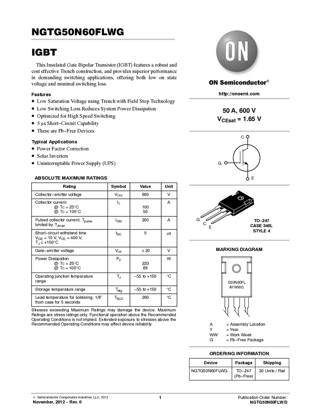 NGTG50N60FLWG IGBT, PFC, High Frequency, 50 A, 600 V