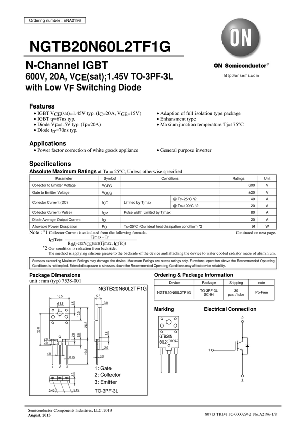 NGTB20N60L2TF1G IGBT, N-Channel 600V, 20A, VCE(sat);1.45V TO-3PF-3L with Low VF Switching D...