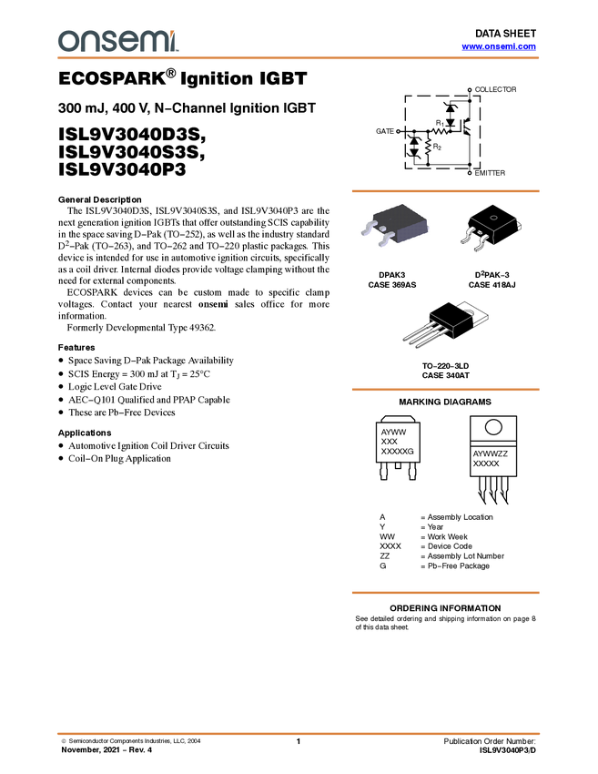 ISL9V3040P3 IGBT, 400V, 17A, 1.58V, 300mJ, TO-220<BR>EcoSPARK® I, N-Channel Ignition