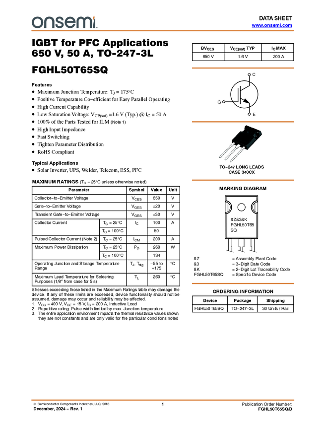 FGHL50T65SQ IGBT 650V FS4 High speed version for PFC application in TO-247