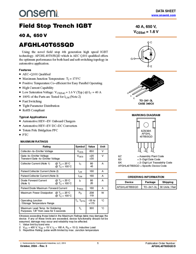 AFGHL40T65SQD AEC 101 Qualified, 650V, 40A Fieldstop 4 trench IGBT