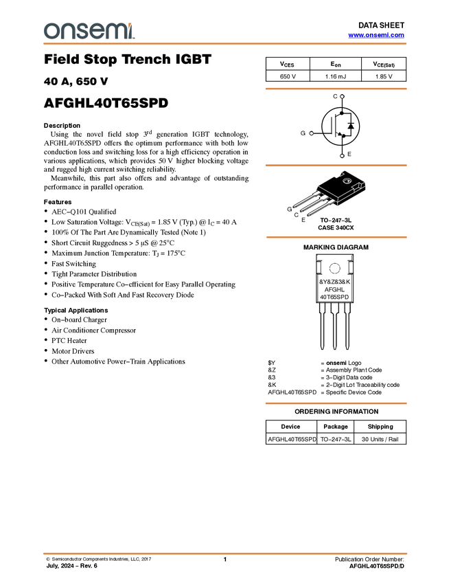 AFGHL40T65SPD IGBT, 650V 40A in TO247 providing enhanced Final Test coverage for better a...