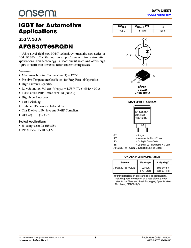 AFGB30T65RQDN IGBT - 650V 30A -Short circuit rated FS4 - Automotive