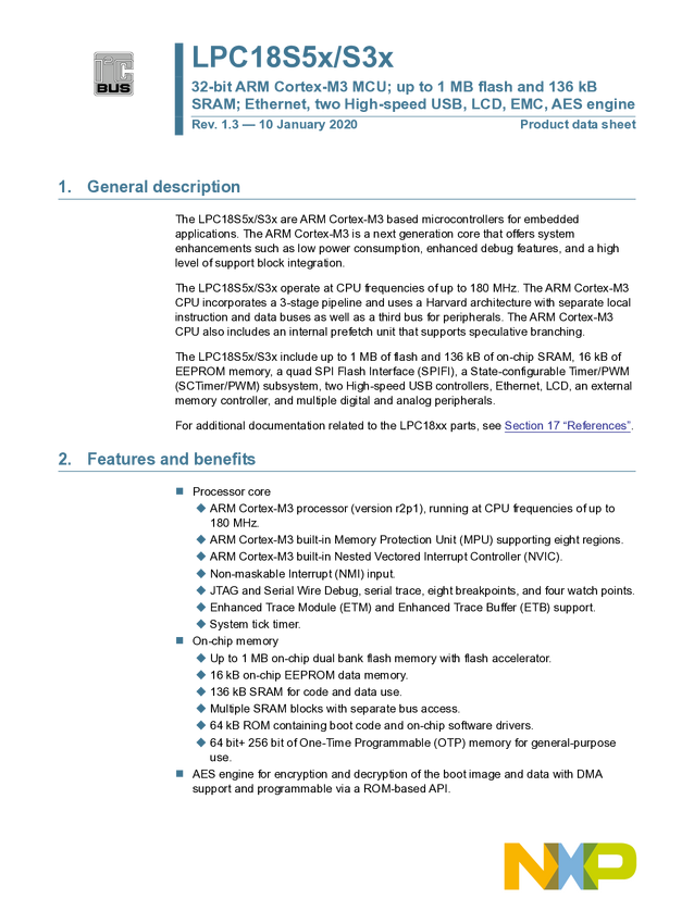 32-bit ARM Cortex-M3 MCU; 1 MB flash and 136 kB SRAM; Ethernet, two High-speed USB, EMC, AES engine