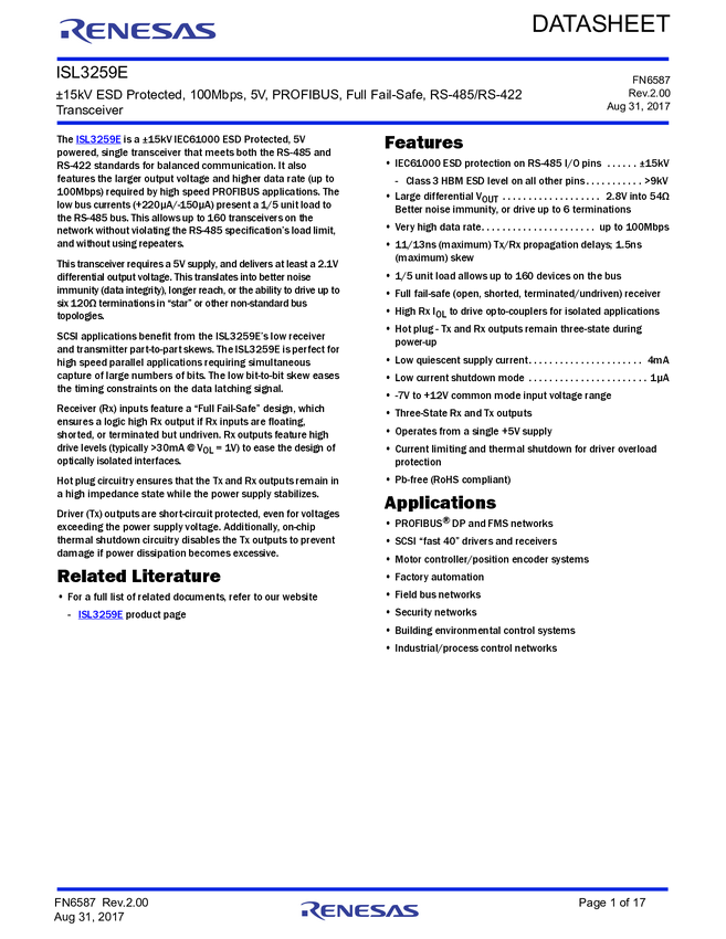 ISL3259EIBZ ±15kV ESD Protected, 100Mbps, 5V, PROFIBUS, Full Fail-safe, RS-485/RS-422 T...