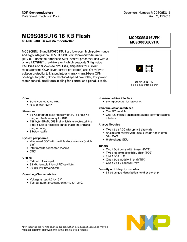 MC9S08SU16VFK 8 bit MCU with S08L core, 16KB flash, 40MHz, UHV technology with GDU, 24QFN
