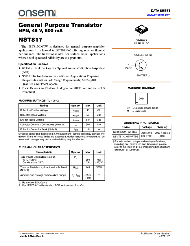 NST817 General Purpose Transistors NPN, 45 V, 500 mA