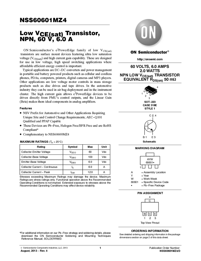 NSS60601MZ4 Low V<sub>CE(sat) Transistor, NPN, 60 V, 6.0 A