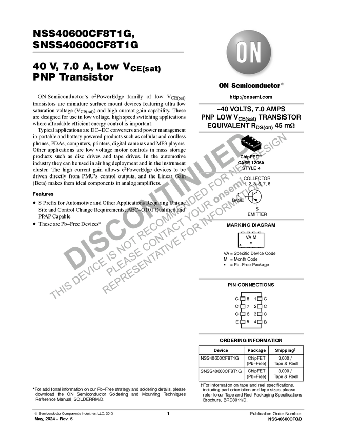 NSS40600CF8 Bipolar Transistor, Low V<sub>CE (sat), PNP, 6.0 A, 40 V