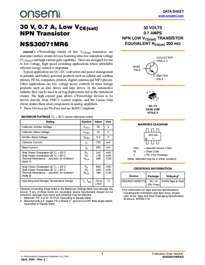 NSS30071MR6T1G 30 V, 0.7 A NPN Low V<sub>CE(sat) Bipolar Transistor