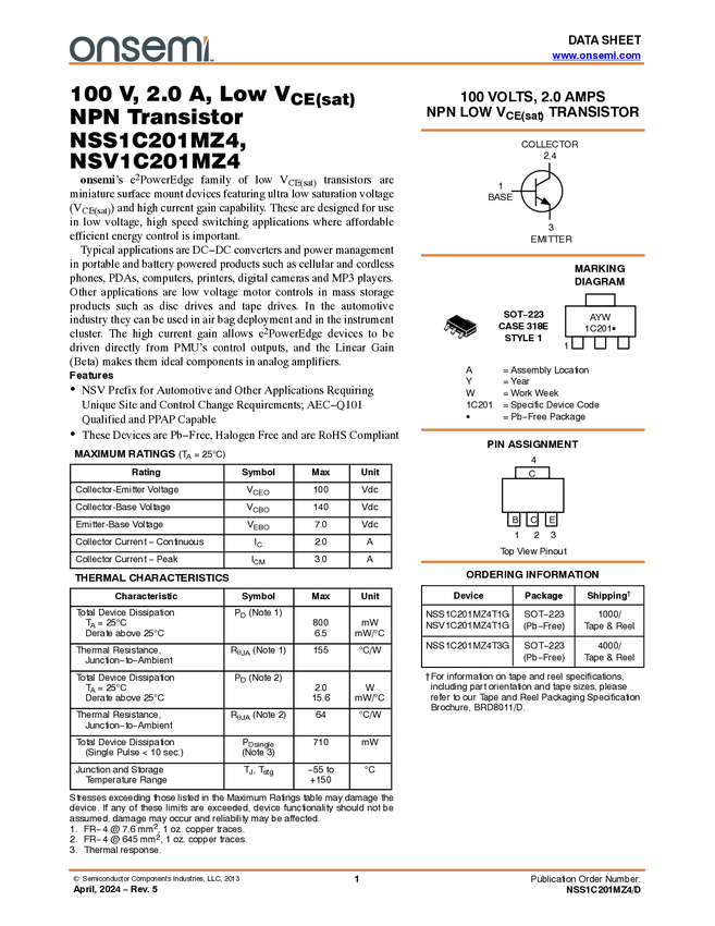 NSS1C201MZ4 2.0 A, 100 V Low V<sub>CE(sat) NPN Bipolar Transistor