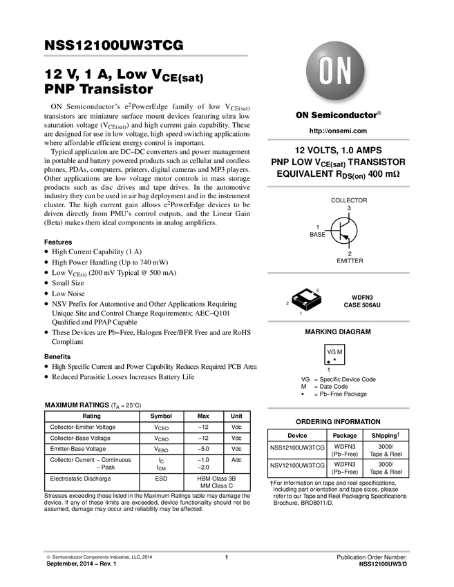 NSS12100UW Low V<sub>CE(sat) Transistor, PNP, 12 V, 1.0 A