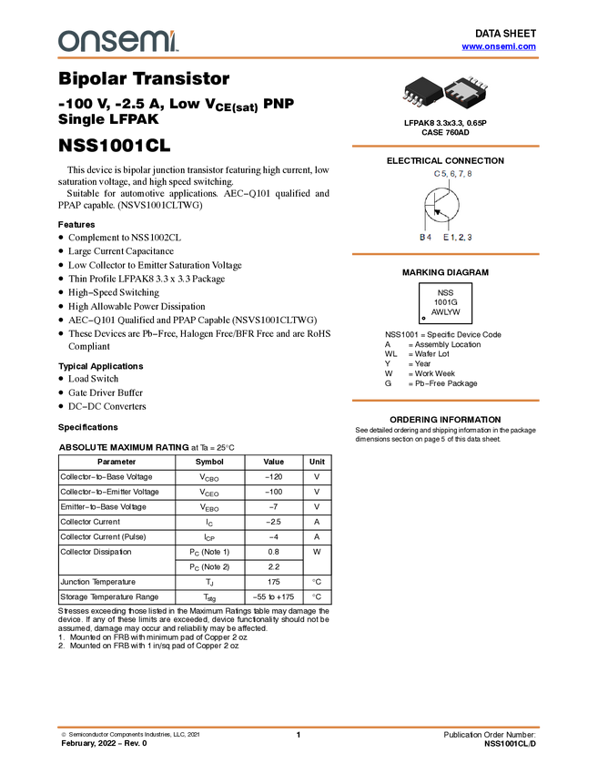NSS1001CL Bipolar Transistor -100V, -2.5A PNP Low VCE(sat) PNP Single LFPAK8