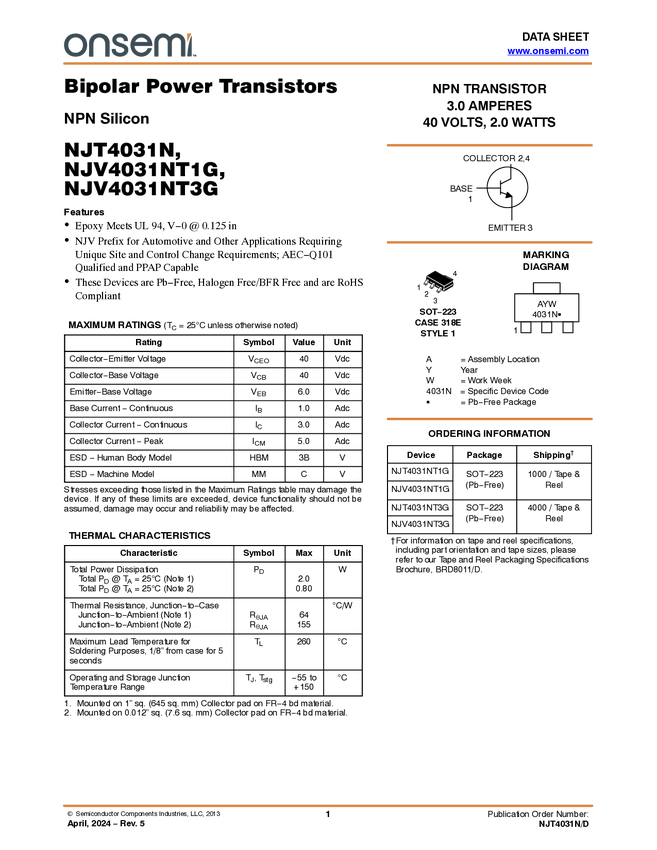 NJT4031N 3.0 A, 40 V NPN Bipolar Power Transistor