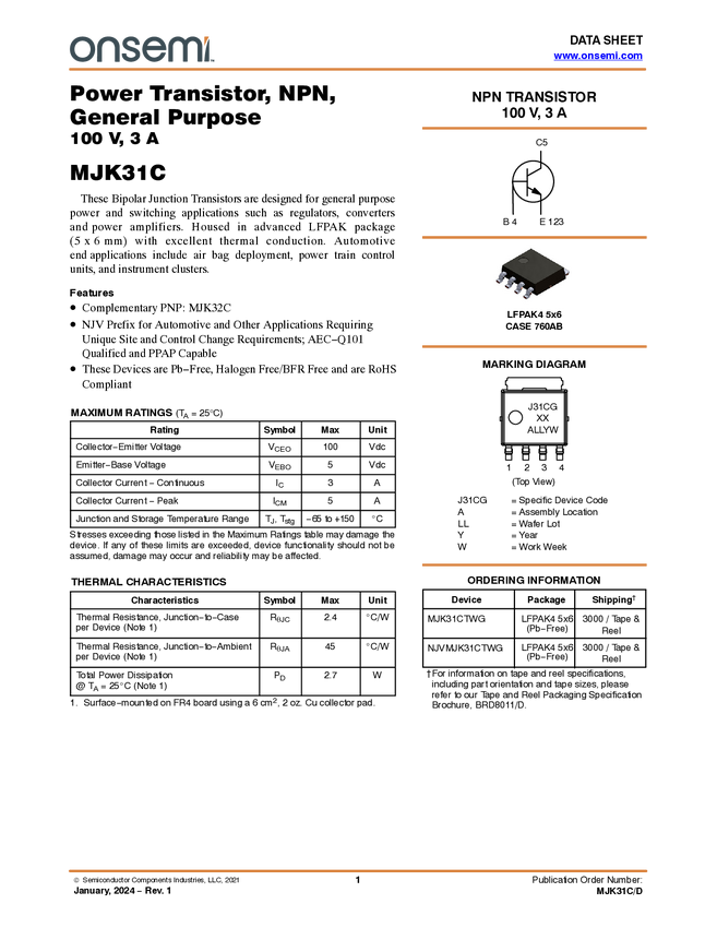MJK31CT Power Transistor 100 V, 3 A General Purpose NPN