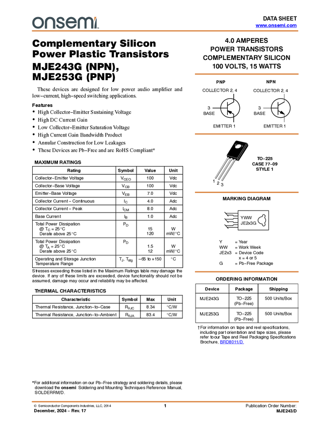 MJE243 4.0 A, 100 V PNP Bipolar Power Transistor