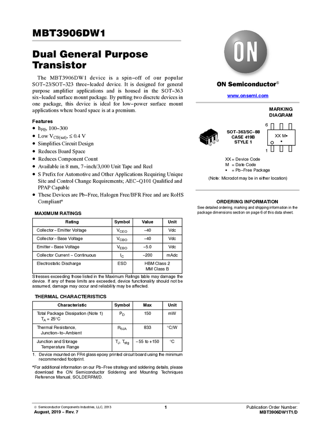 MBT3906DW1 Dual PNP Bipolar Transistor