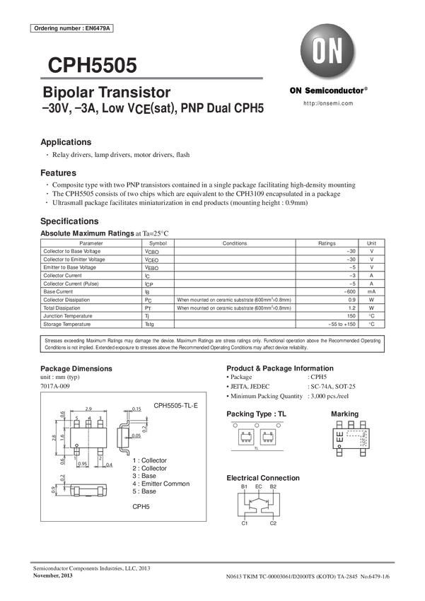 CPH5505 Bipolar Transist, -30V, -3A, Low VCE(sat), PNP Dual CPH5